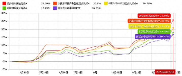 与永赢半导体产业智选、德邦半导体产业和银河创新成长相比,诺安研究优选近一个月的涨幅也要大的多,跑出了更高的收益,确实是很猛。